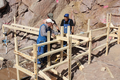 Sillä aikaa minä porailin vuokrakoneella tartuntoja kallioon, jotta saadaan perusmuuri pysymään varmasti paikoillaan. Reikä pitää olla 500mm:n välein ja minimissään 150mm kallion sisällä. Vuokraamot kaikki myivät eioota, kun kysyttiin kallioporaa. Kuulemma ei kannata pitää vuokralaitteina kun on niin kovat huoltokustannukset. Viimein saimme Ramirentistä polttomoottorikäyttöisen poravasaran tai mikä lie olikaan ja siihen Hiltin terä. Tätä ei pari päivää aikaisemmin edes mainostettu meille tai suositeltu, koska kalliokoneet on erikseen (joita kukaan ei vuokraa). Tästä taas opimme, että ei kannata mainostaa liikaa kallioon poraamista tai sitten pitää puhua vain paristakymmenestä reiästä ( oikeasti reikiä oli meillä liki sata ), jolloin vuokraajatkin uskaltavat antaa vuokralle tuommoisen laitteen ja terän. Reiät piti porata "kuivana", mutta puolessa välissä piti puhaltaa reiät puhtaiksi pölystä, jotta terä alkoi taas purra. Painaa ei uskaltanut ettei terä hajoa. Kun kaikki reiät oli saatu porattua ensin puoleen väliin, niin mikki hiiri -kello alkoi näyttämään sen verran iltaa, että oli pakko alkaa painamaan konetta silläkin uhalla, että tuhoamme kalliin terän. Johan alkoi reiät syventyä ja viimeisen porauksen jälkeen terä oli edelleen kuin uusi! Eli saa antaa palaa vaan, mutta täytyy pitää pienet kierrokset, koska muuten ainakin tuo kone alkoi pomppia ihan hervottomasti joka varmasti tuhoaa kovametallikärjen. Ja kunnon terä kestää ainakin sen sata reikää, jos työskentelee "kuin omaa terää käyttäisi".